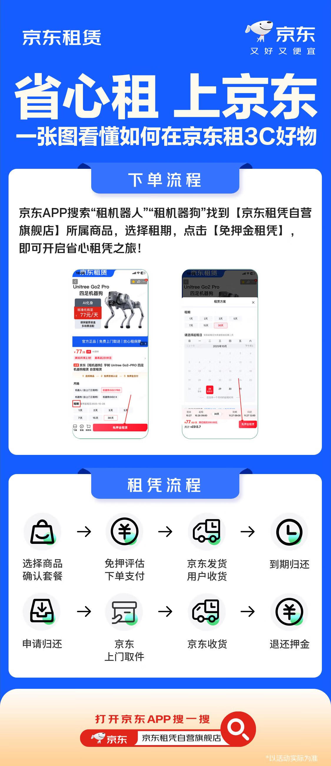 目前,京东3C数码自营租赁笼盖智强人形机械人、四脚机械狗产物,后续该办事还将逐渐拓展至无人机、活动相机等3C数码全品类产物。本日起,用户正在京东APP搜刮“租机械人”,即可省心租宇树G1 EDU人形机械人、Go2-Pro四脚机械狗、Go2-X四脚机械狗,同时享免押金租赁、大额满减、限时扣头等多沉优惠:机械人场景化租赁享满1499元减1000元,机械狗场景化租赁享满1499元减500元,机械狗尺度化租赁享满459元减200元、满299减150元。同时,日房钱随租期耽误递减。具体而言,宇树G1 EDU人形机械人(含上门工程师)场景化日房钱低至1886元。宇树Go2-Pro机械狗(含上门工程师)场景化日房钱低至818元。宇树Go2-Pro四脚机械狗、宇树Go2-X四脚机械狗,尺度化日房钱低至77元。