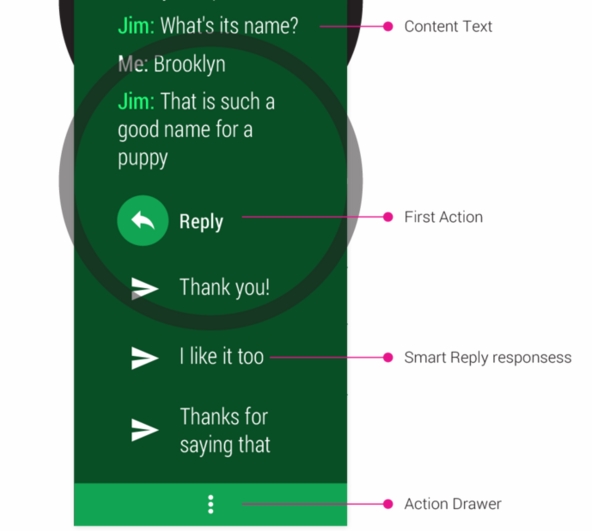 别的用手表进行动静答复时,将会有智能保举的短语(smart reply),让你的答复更快速高效。好比下面这段对话!