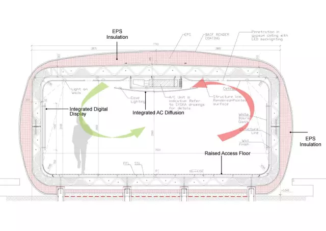 建建的全数布局利用一个高20英尺,长120英尺,宽40英尺(约6米*36米*12米)的3D打印机和添加混凝土打印手艺。打印机操纵全从动机械臂实现打印过程,用时17天,现场安拆2天。后续的办事、室内和景不雅破费了大约3个月。比拟保守的小标准建建,立异施工手艺削减了一半的劳动成本,场地损耗最小化,