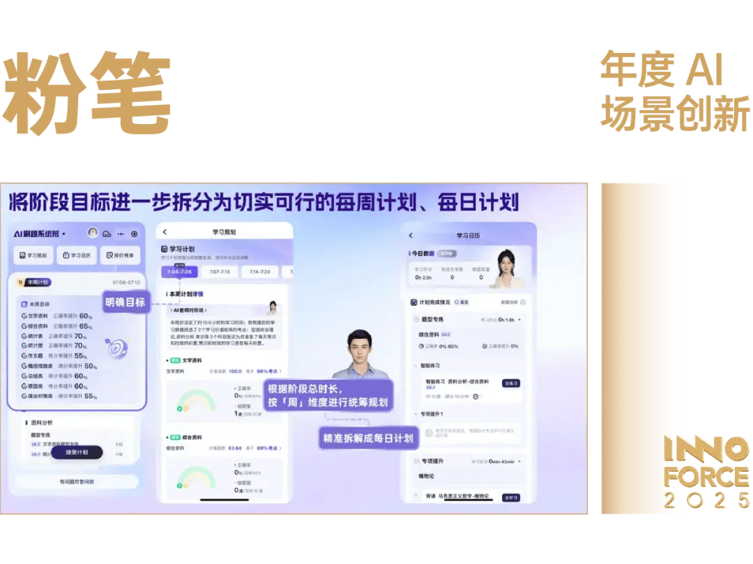 粉笔开创性地以「自研垂域大模子」为焦点,将 AI 深度使用于、教资等职业教育的焦点备科场景,成功打制了中国职业教育范畴,首个实现 AI 使用场景规模化落地取贸易闭环的典范。正在手艺层面,粉笔第一次退职业教育范畴,基于超 7000 万用户的进修反馈取资深教研数据,锻炼出表示优于通用大模子的垂域大模子,处理了公考等专业场景下「AI 不敷懂行」的难题。正在产物层面,它不只是做「AI+东西」,而是建立了「AI 教员+AI 面试+AI 刷题班+AI 硬件」的完整进修闭环,以「名师+AI 数字人」双师模式,打破了保守「一刀切」的课表,实现了千人千面的个性化高效备考。自 2024 年推出垂域大模子以来,粉笔的 AI 产物矩阵敏捷成为其「新增加点」。截至 2025 年,AI 使用已累计办事超 1500 万用户,付费用户数超 150 万,让职业教育获得了 AI 能力的沉塑。粉笔的冲破不只是单一的产物立异,更是对保守职业教育「千人一面」模式的深刻变化。它凭仗正在「垂域大模子」上的初创性摸索,以及对「AI 产物矩阵」的快速结构,无力冲击了「名师资本稀缺、个性化高贵」的行业痛点,为数万万考生供给了更高效、更普惠的智能教育处理方案,