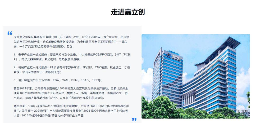 据嘉立创官网引见,该公司成立于2006年,是立脚深圳、全球领先的电子及机械财产一坐式根本设备办事供给商,为全球数百万电子工程师供给“一个概念进,一个产物出”的全链硬件立异办事。截至目前,公司已持续5年进入“胡润全球独角兽榜”,并获得“Top Brand 2025中国品牌500强”“人平易近日·2024新质出产力赋能高质量成长案例”“2024 IDC中国将来数字工业领航者大”“2023年胡润中国500强”等国表里多项行业内荣誉。